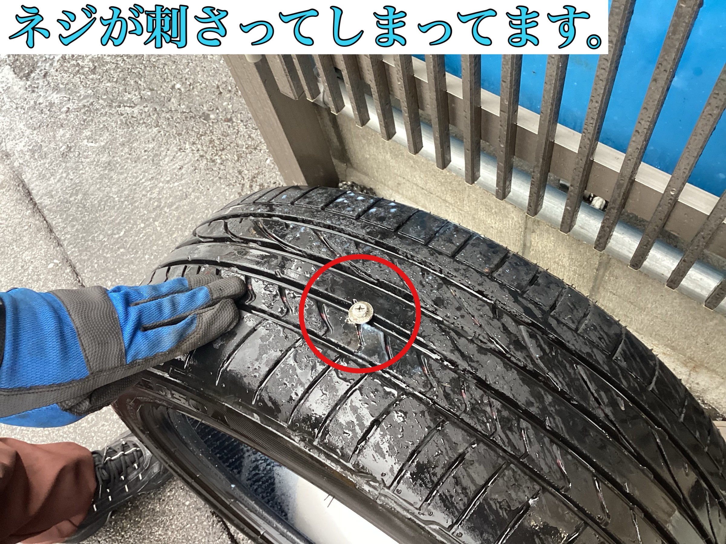 今回はタイヤにネジが刺さってしまい、空気が漏れてしまっています。