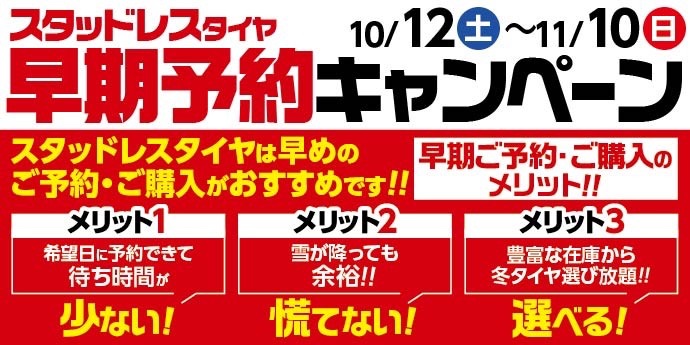 スタッドレスタイヤ早期予約キャンペーン中です ポスト 2024年10月12日 スタッドレスタイヤのご準備はお済ですか? 10/12(土)~11/10(日) スタッドレスタイヤ早期予約キャンペーンを開催いたします。 この機会に是非、ご相談ください。 タイヤ館 上尾 住所:362-0081埼玉県上尾市壱丁目北15-3 電話番号: 048-726-7870 相談予約 タイヤ点検・安全点検/タイヤ履き替え/オイル交換/その他ピット作業の予約 カテゴリ:タイヤ関連 お知らせ