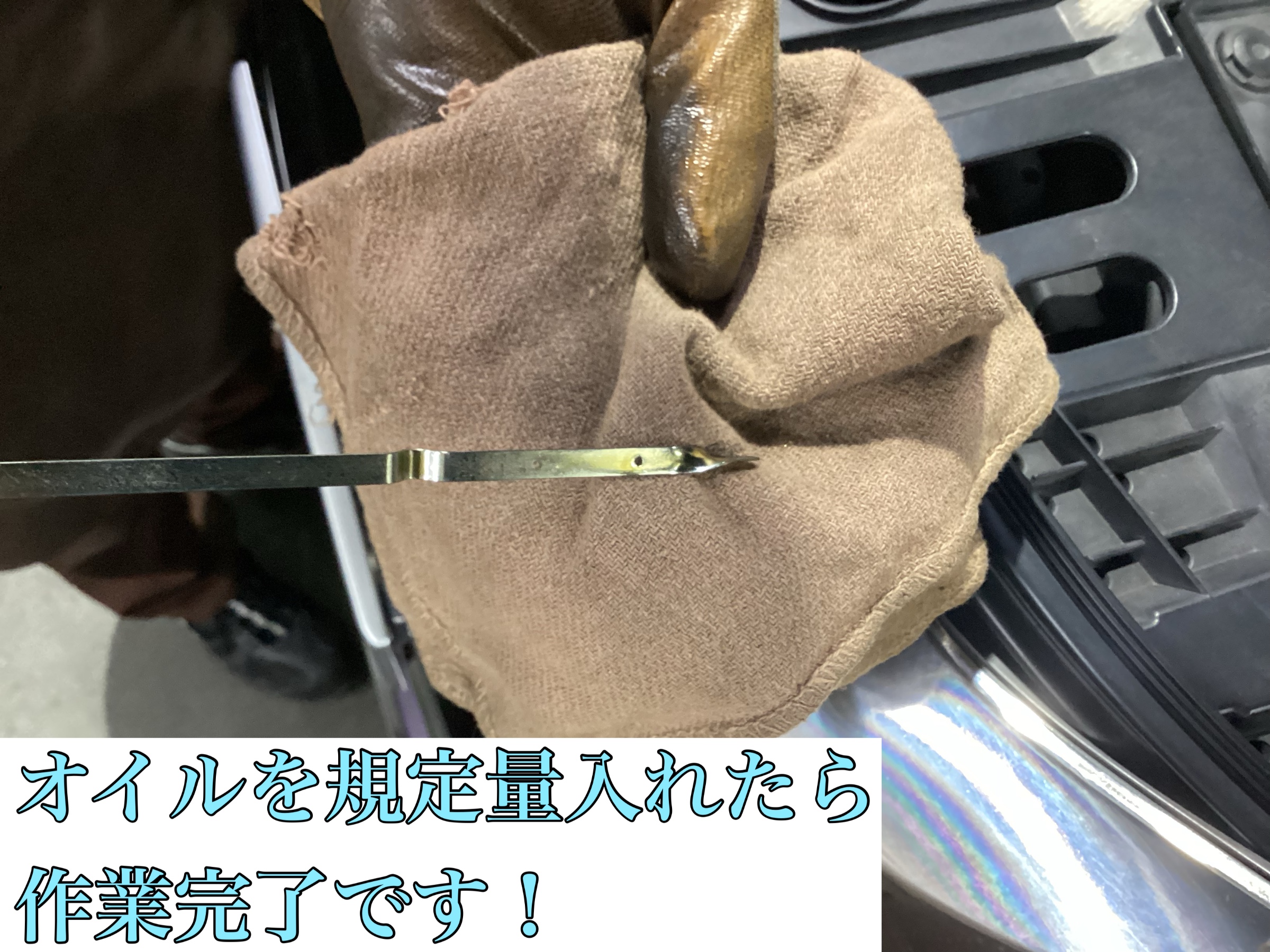 エンジンをかけて、ドレンボルトとエレメントのダブルチェックをしたらオイル量を微調節します。
