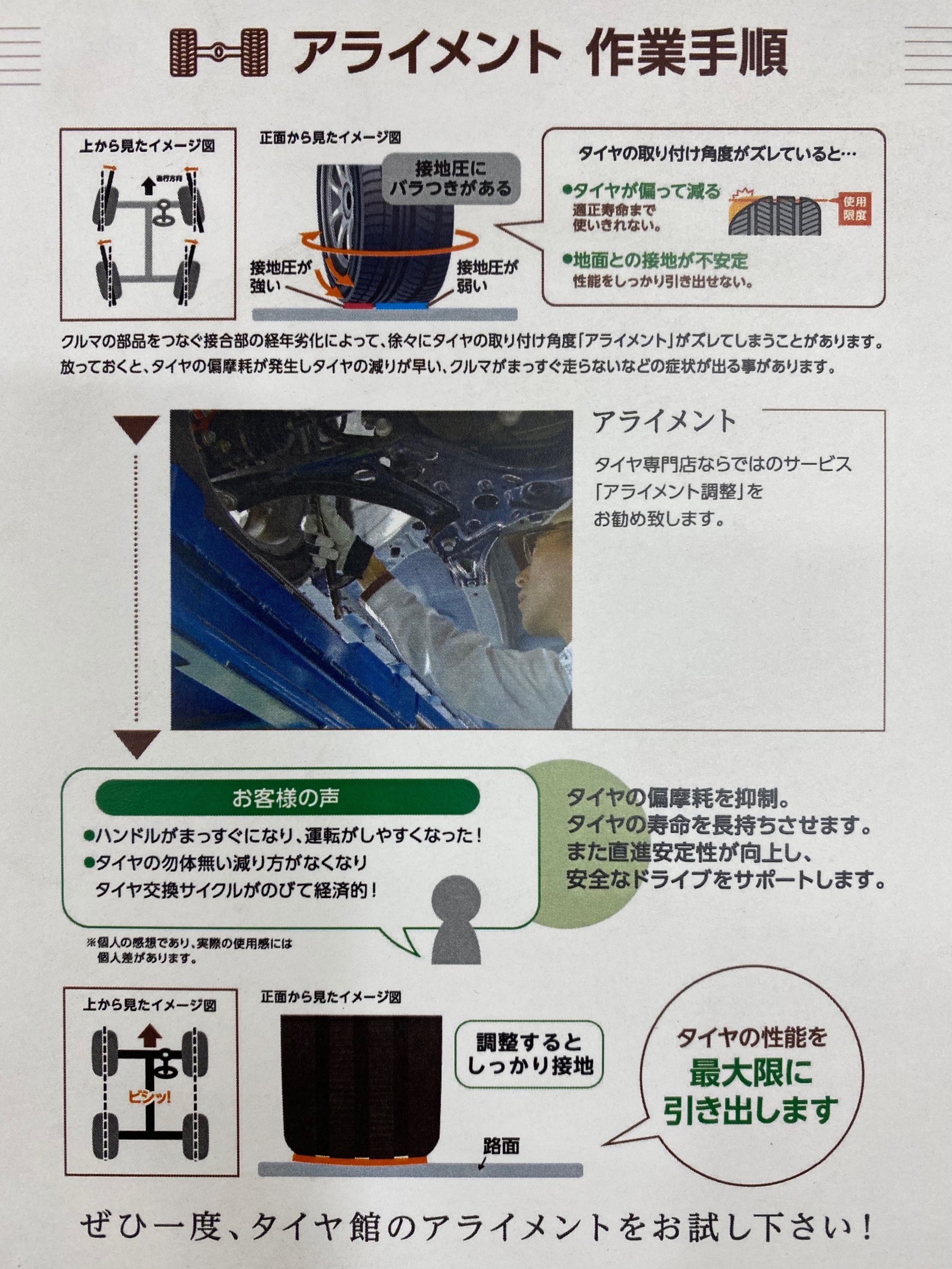 タイヤ館はタイヤの専門店です!専門店ならではのアライメント調整のご紹介!