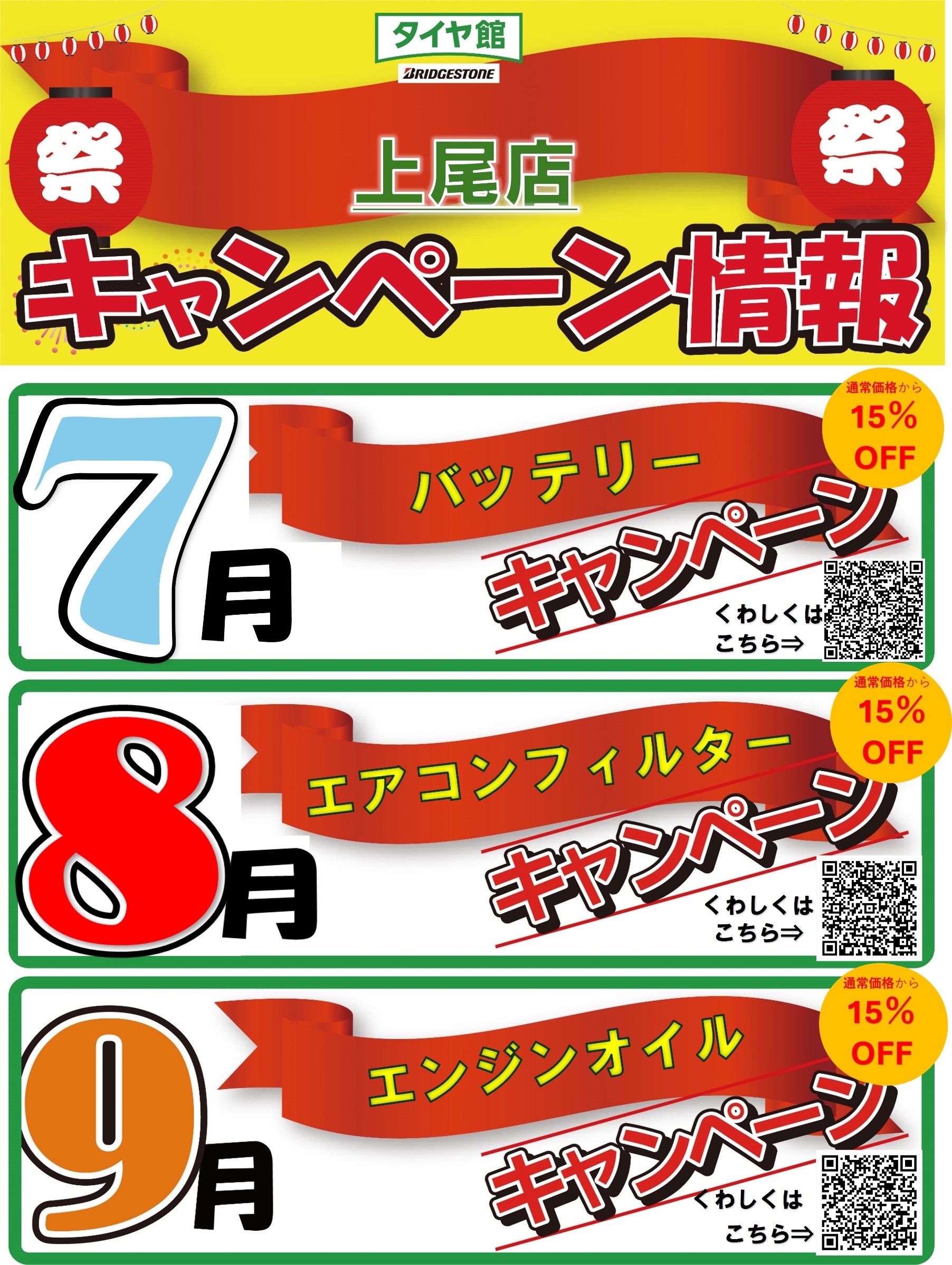7月はバッテリーがお得!!3か月イベントのお知らせ! ポスト 2025年7月12日 皆さんこんにちは!タイヤ館上尾店です! 本日は毎月行なっているイベントのご紹介! 今月はバッテリーが値引きとなります! おでかけ前にバッテリー交換がオススメです! 皆様のご来店お待ちしております。 タイヤ館 上尾 住所:362-0081埼玉県上尾市壱丁目北15-3 電話番号: 048-726-7870 相談予約 タイヤ点検・安全点検/タイヤ履き替え/オイル交換/その他ピット作業の予約 カテゴリ:お知らせ その他メンテナンス