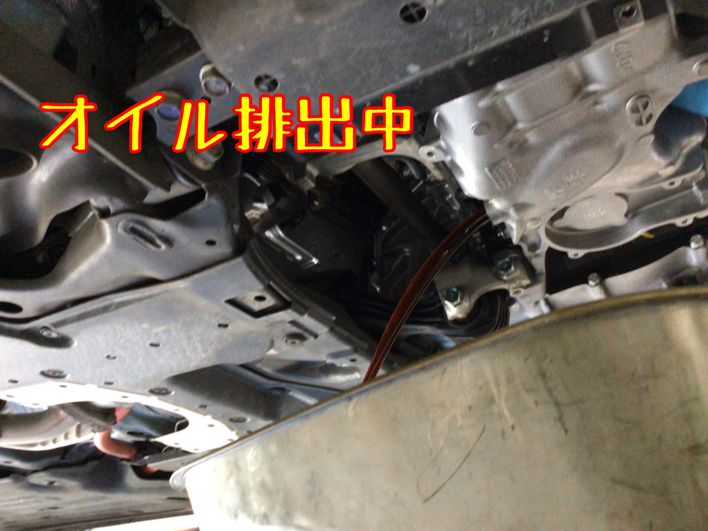 ↑作業中の写真です。車体下部より、エンジンオイルを排出します。