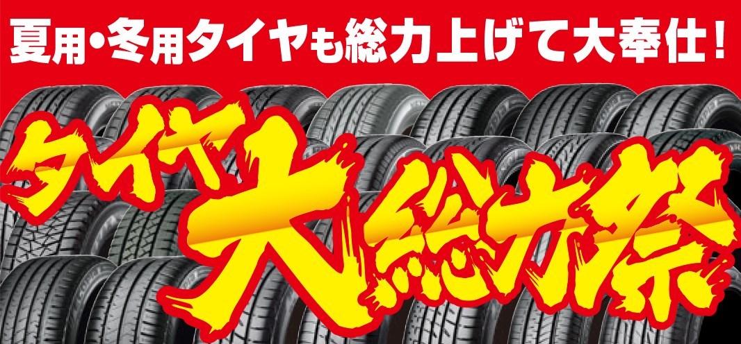 タイヤ大総力祭開催 ポスト 2017年10月27日 10月28日(土)から11月5日(日)まで タイヤ大総力祭を開催いたします!! 夏用・冬用タイヤも総力上げて大奉仕!!お車のメンテナンスもお任せください!!スタッドレスタイヤへの履き替えが始まっています! 冬タイヤの履き替えは混雑前の早めのお取り付けがオススメです! 是非、この機会にご来店お待ちしております。