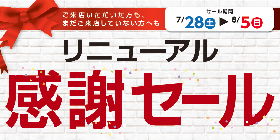 明日からリニューアル感謝セール開催いたします! ポスト 2018年7月27日 4月28日のオープニングセールにご来店いただいたお客様ありがとうございます。 多くの皆様にご利用いただき大盛況でしたが、 大好評につき第2弾セールとしてリニューアル感謝セールを開催しちゃいます!! ※開催期間は7月28日(土曜日)から8月5日(日曜日)まで この夏の暑さに負けないくらい当店スタッフ全力で開催いたします! 皆様のご利用お待ちしています。