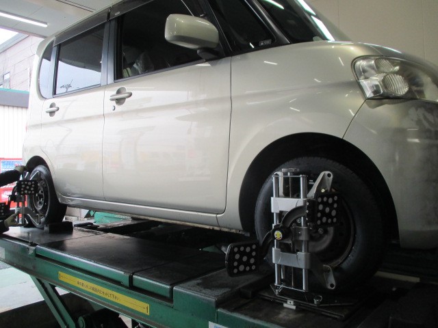 ダイハツのタントのタイヤ交換とアライメント施工実施しました。