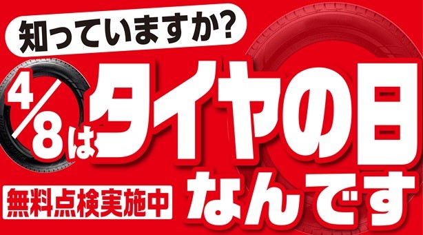 4月8日はタイヤの日 ポスト 2019年4月8日 タイヤ館上尾店です! 皆様、突然ですが4月8日がタイヤの日なのはご存知ですか? タイヤは車にとって、とても大切な部品です。 皆様のお車のタイヤ状態は大丈夫ですか? 溝が少ないタイヤや、空気圧不足はとても危険です。 タイヤ点検・空気圧チェックを無料で行っております。 是非この機会に点検してみませんか? 皆様のご利用お待ちしています。