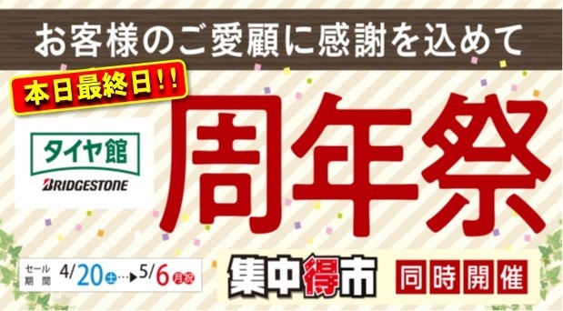 セール最終日! ポスト 2019年5月6日 本日最終日!タイヤ館上尾店リニューアルさせて頂いてから一周年!日頃の感謝を込めて!タイヤ館上尾店は『周年祭』開催中!!本日最終日です!!!タイヤ交換をお考えの方お買い得タイヤから新商品REGNO GR-XIIも好評発売中です。メンテナンスの点検も無料点検実施中です。オイル・バッテリーなどのメンテナンス品もご相談ください。皆様のご来店お待ちしております!