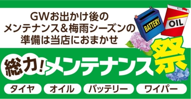 梅雨前準備いかがですか? ポスト 2019年5月17日 GWお出かけ後&梅雨前準備にお車のメンテナンスいかがですか? タイヤ館上尾店では、ただいまメンテナンス商品を無料点検実施中です! 点検だけでもお気軽にご利用ください。 皆様のご来店お待ちしています。