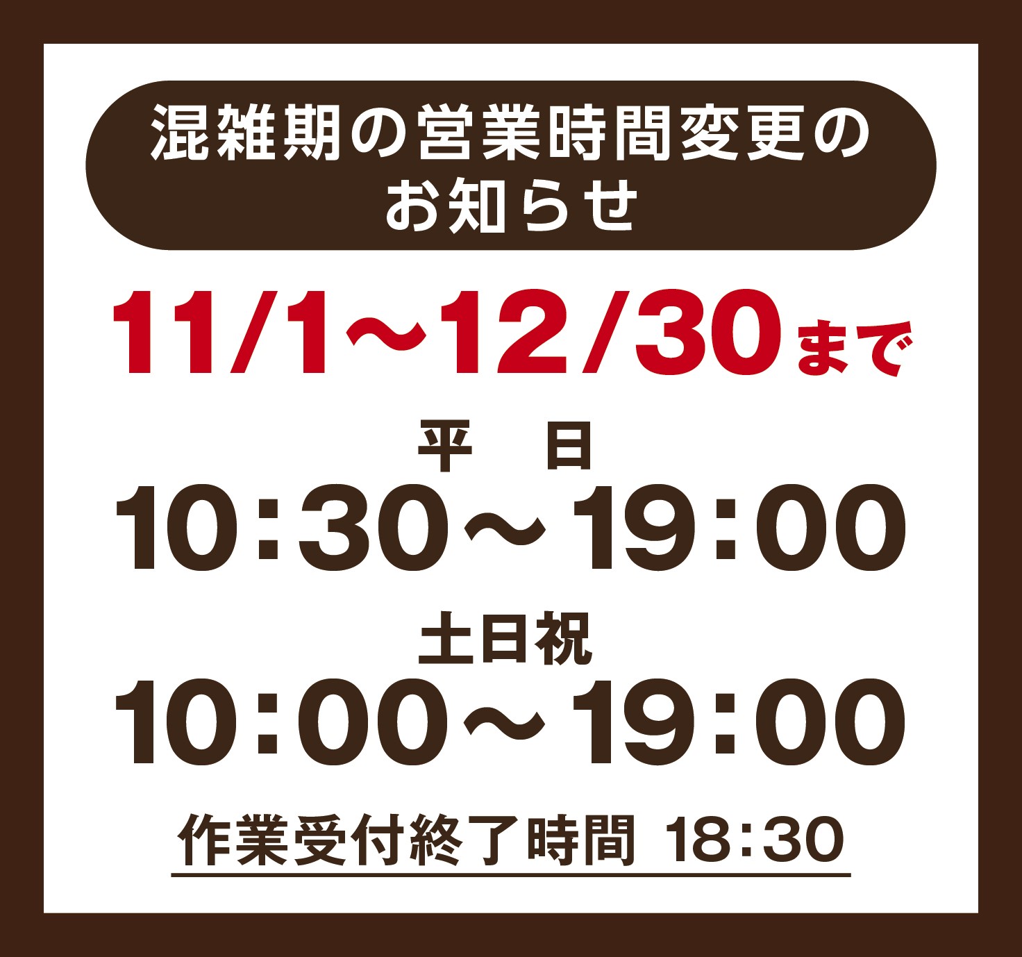 混雑期営業時間のお知らせ ポスト 2019年10月27日 11月から営業時間の変更がございます。 平日 10時30分より開店、19時まで営業となり 土・日・祭日は 10時より開店、19時までの営業に変更となります。 ご迷惑をおかけいたしますが宜しくお願いいたします。