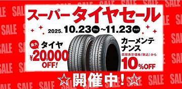 ただいま当店ではスーパータイヤタイヤセール開催中です(*^^)vセール期間中ブリヂストンタイヤ4本ご購入で最大20,000円OFF!さらにオイル・バッテリーなど対象のメンテナンス商品も10%OFF!詳しくはWEBトップページもしくはお気軽に店頭スタッフまで(^_-)-☆愛車無料安全点検も実施しております!...