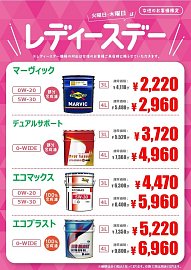 毎週火曜日、木曜日限定!!レディースデイでお得にオイル交換!