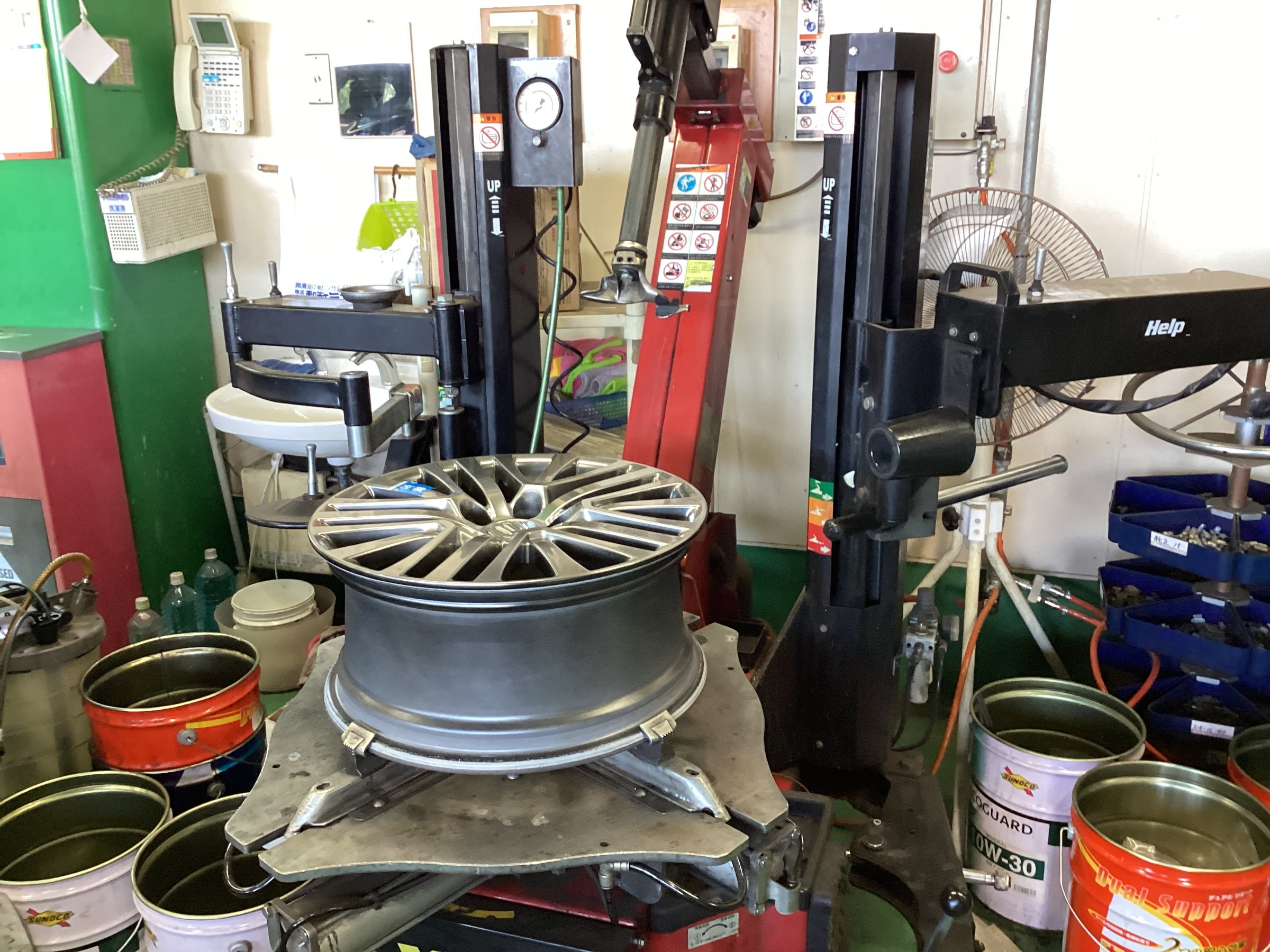 作業はまずはタイヤチェンジャーを使い古いタイヤをホイールから外します。