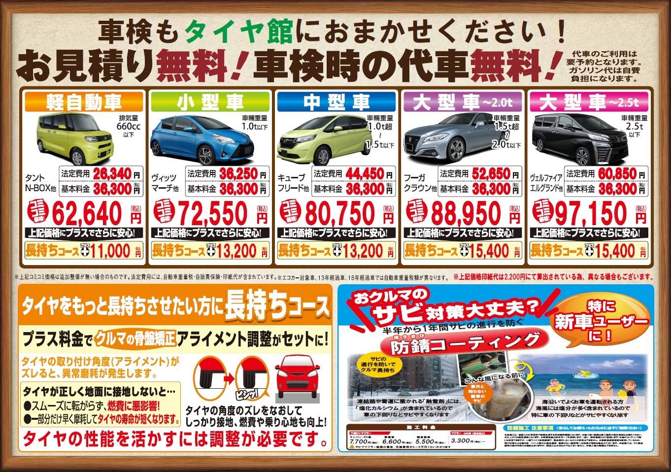 タイヤ館では車検も受け付けております!代車無料!お見積もり無料!