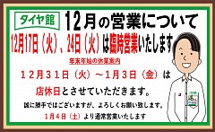 本日、30日(月)を持ちまして今年度の営業は終了となります。 今年一年、ご来店いただきましたお客様、本当にありがとうございましたm(__)m 来年もタイヤ館明石をどうぞよろしくお願いいたします。 年末年始のご案内をさせていただきます。 お客様のご来店、心よりお待ち致しております。