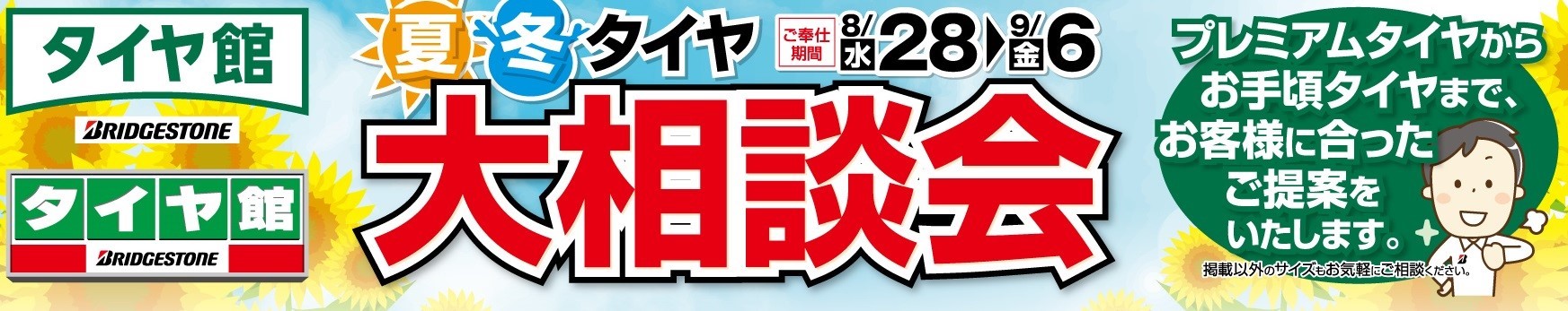 こんにちは。 まだまだ暑い日が続きますね。 そんな皆様にHOTな情報です。 ただいまタイヤ館明石では、夏冬タイヤ『大相談会』を開催中です!! 増税前のお得なこの機会に、是非タイヤ館明石をご利用ください!! 詳しくはスタッフまでお気軽にお声がけ下さい。