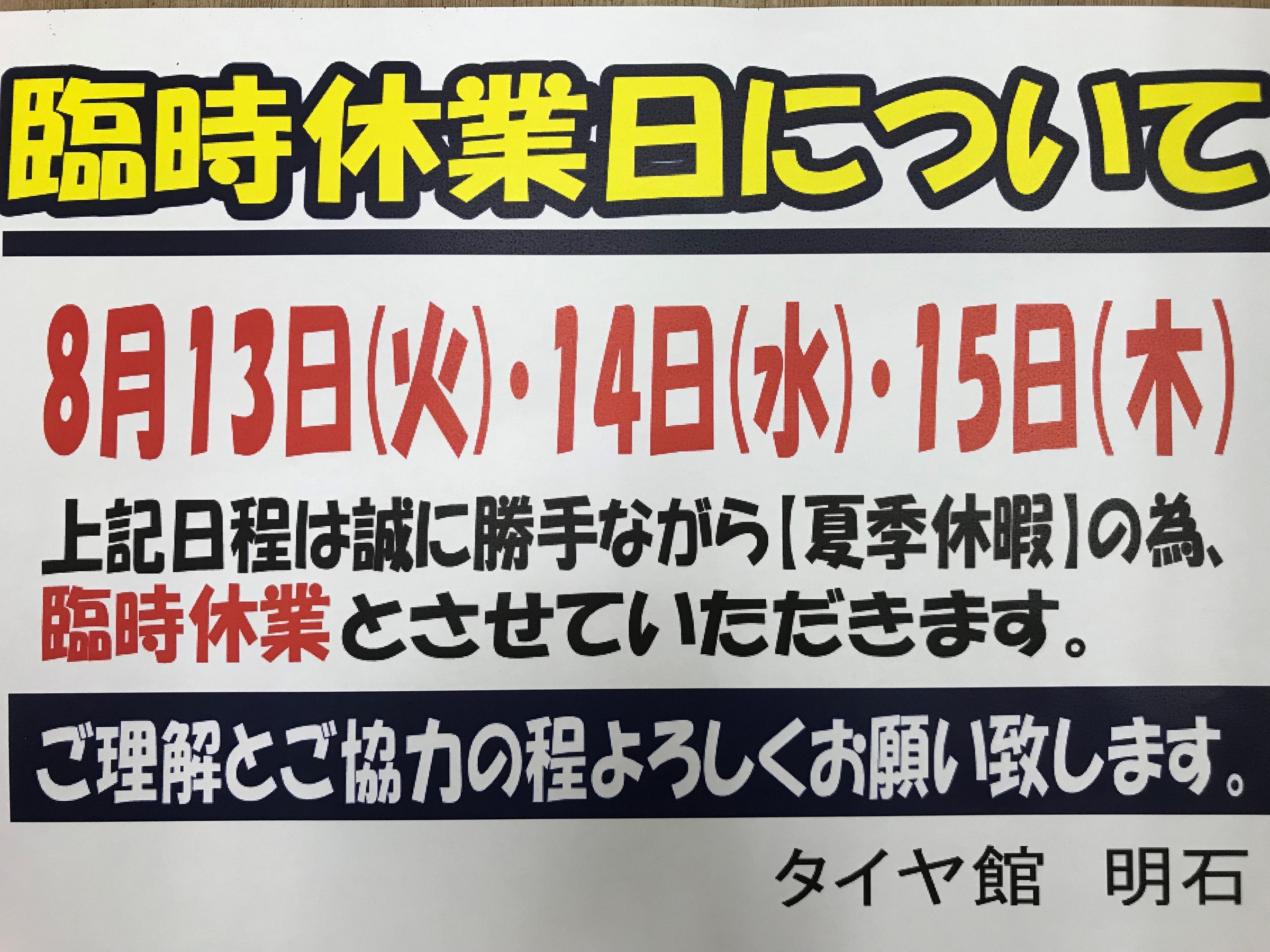 こんにちは。 お盆に伴う臨時定休日のお知らせです。 13日(火)の定休日に加え、14日(水)15日(木)と定休日にさせていただきます。 16日(金)は通常通り朝10時30分~夜19時までの営業となります。 誠に勝手ではございますが、ご理解の程よろしくお願いいたします。