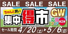 4月14日 までの 『 集中得市 GW応援フェア 』に 沢山のご来店ありがとうございました!! 『 集中得市 GW応援フェア 』の大好評をうけて、 今週末より『 集中得市 GW応援フェア 第2弾 』の開催が決定致しました!! フェアについては詳細が分かり次第に随時紹介させていただきます!