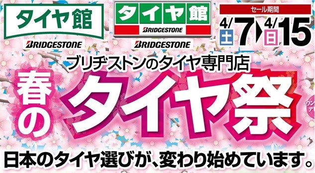 タイヤ館明石店では4月7日(土)から15日(日)まで春のタイヤ祭りを 大好評、開催中です!! 夏用タイヤも冬用タイヤもお買い得!! お出かけ前のメンテナンスも当店に是非、お任せください!! オイル・バッテリー・エアコンフィルター等、無料で点検致します☆ 初日、大好評で多くのお客様にご来店...