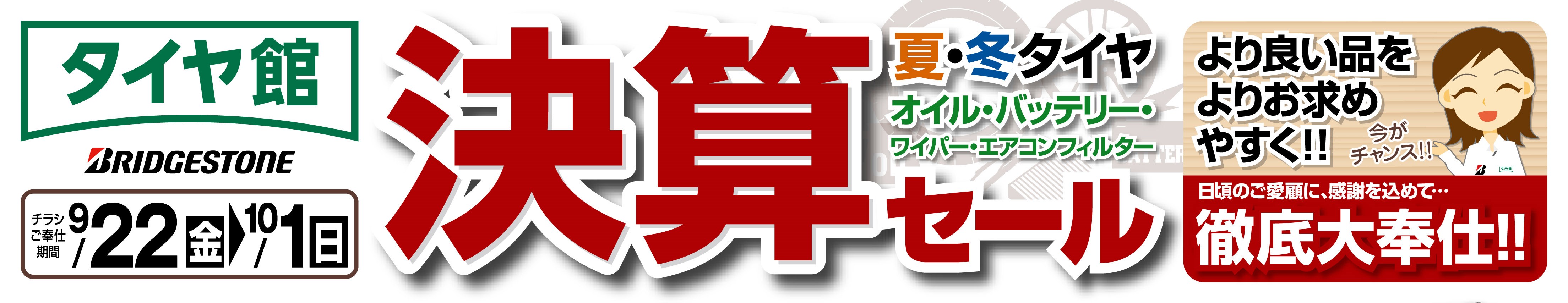 いよいよ始まります『決算セール』開催いたします♪ 秋の行楽前に安心安全を手に入れましょう(^O^)/期間は9月22日(金)~10月1日(日)まで!タイヤ、オイル、バッテリーなどなど、お車の夏の疲れをリフレッシュしましょう(*^_^*)スタッドレスタイヤも絶賛予約受付中!(^^)!ぜひご来店くだ...