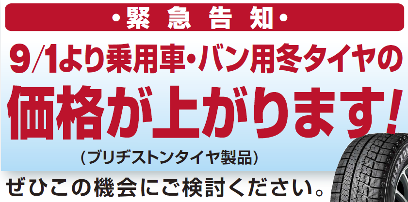 夏タイヤに引き続き、冬タイヤの値上げが発表されました。 9月1日より値上げ開始です。 今年は交換時期だったというお客様! 旧価格のうちに交換をオススメいたします。 また、現在庫につきましては特価での販売を予定しておりますので、 サイズが合えばお得に交換していただけます! 詳しくはスタ...