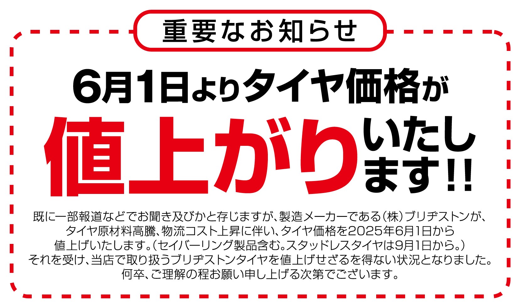 明石市藤江のタイヤ専門店。 タイヤ館明石店です。 6月1日の夏用タイヤ値上がりまで、残り期間がわずかとなりました。 タイヤ交換時期のお客様は、値上がり前のご検討がお得になります。 また交換時期かどうかわからないという方には、無料点検も実施中です。 気になる方は、ぜひタイヤ専門店にお...