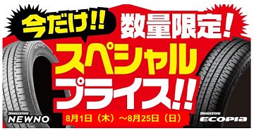各サイズ限定3セット! 『今だけ』のスペシャルプライスでご提供! 期間限定:8/1~8/25まで 『タイヤのお値段』、『タイヤの性能』 両方を重視されるお客様にオススメ! ブリヂストン『NEWNO』『ECOPIA』が 期間限定でスペシャルプライスにΣ(・ω・ノ)ノ! ブリヂストンの従来品と比較して 雨の日の安全...