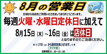 みなさまこんにちは╰( ̄ω ̄o) 兵庫県明石市の藤江にございます、 タイヤ館明石店です☆彡 お盆休みについてお知らせいたします 上記画像の通り 通常の火曜日、水曜日定休に加え 16日(金)までお休みを させて頂きますm(__)m 8月13日(火)~8月16日(金)の計4日間 お休みとなります。 大変ご不便...