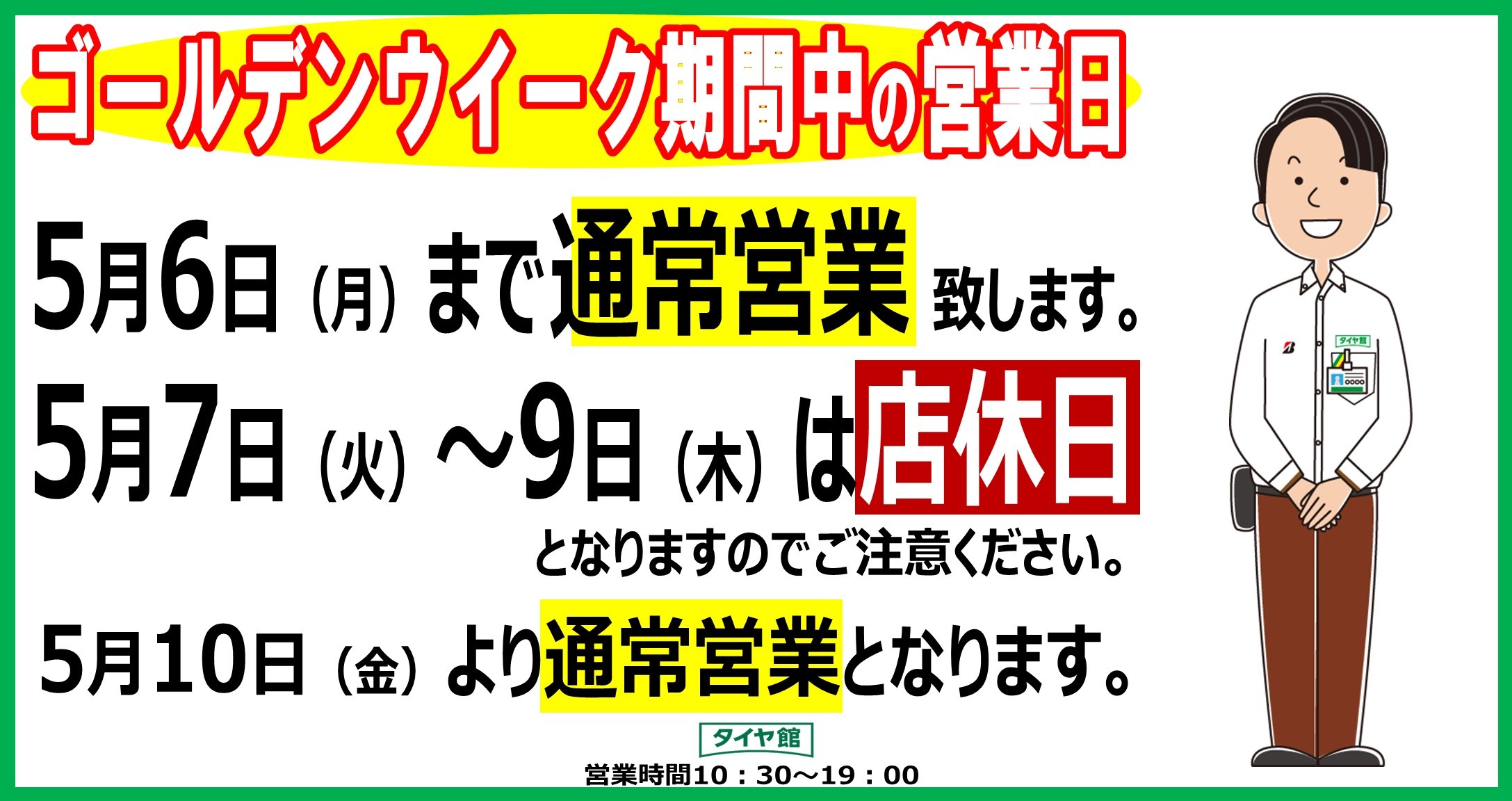 いつもタイヤ館明石店のホームページを ご覧頂きありがとうございます♪♪ GW期間中の営業日について ご案内申し上げます。 5月6日(月)までは通常通り営業致します。 5月7日(火)~5月9日(木)は 店休日になります。 ご不便をおかけ致しますが宜しくお願い致します。