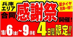いつもタイヤ館明石店のホームページを ご覧頂きありがとうございます! 現在 【秋のプレミアムタイヤセール】 開催中ですが更に本日より 夏タイヤ在庫一掃 お客様【感謝祭】も同時開催致します(^O^) 感謝祭は 10/6(金)から10/9(月・祝)までの4日間限定!! ・オールシーズンタイヤ ・お得なアウト...
