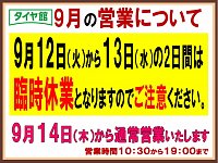 いつもタイヤ館明石店のホームページを ご覧頂きありがとうございます♪♪ タイヤ館明石店の 【9月の休業日について】ご案内です。 明日9月12日(火)~13日(水)までの2日間は 店舗のお休みになりますので ご理解の程宜しくお願い致します。 また、9月14(木)10:30より 元気に営業致しますので宜しくお願...