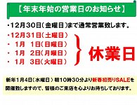 いつもタイヤ館明石店のホームページを ご覧頂きありがとうございます♪♪ 再度ご案内致します。 年末年始期間の営業は下記の通りご案内申し上げます。 お客様には、ご不便をお掛け致しますが、 何卒ご理解ご協力くださいますようお願い申し上げます。 【年末年始の営業日のご案内】 12月30日(木曜日...