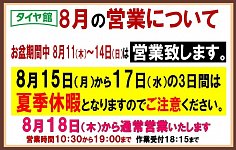 いつもタイヤ館明石店のホームページを ご覧頂きありがとうございます♪♪ タイヤ館明石店の 【お盆期間中の営業日について】ご案内です。 お盆期間中は8月11日(木)~14日(日)までは 通常営業致します。 8月15日(月)~17日(水)までの3日間は 店舗のお休みになりますので ご理解の程宜しくお願い致しま...