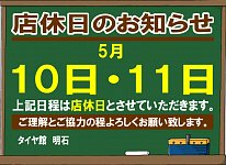 いつもタイヤ館明石店のホームページを ご覧頂きありがとうございます。 ◆◆◆ 店休日のお知らせです。 ◆◆◆ 10日(火)・11日(水)は 店休日とさせていただきます。 13日(木)は通常通り 【 10時30分~19時 】までの営業となります。 誠に勝手ではございますが、 ご理解の程よろしくお願いいた...