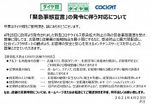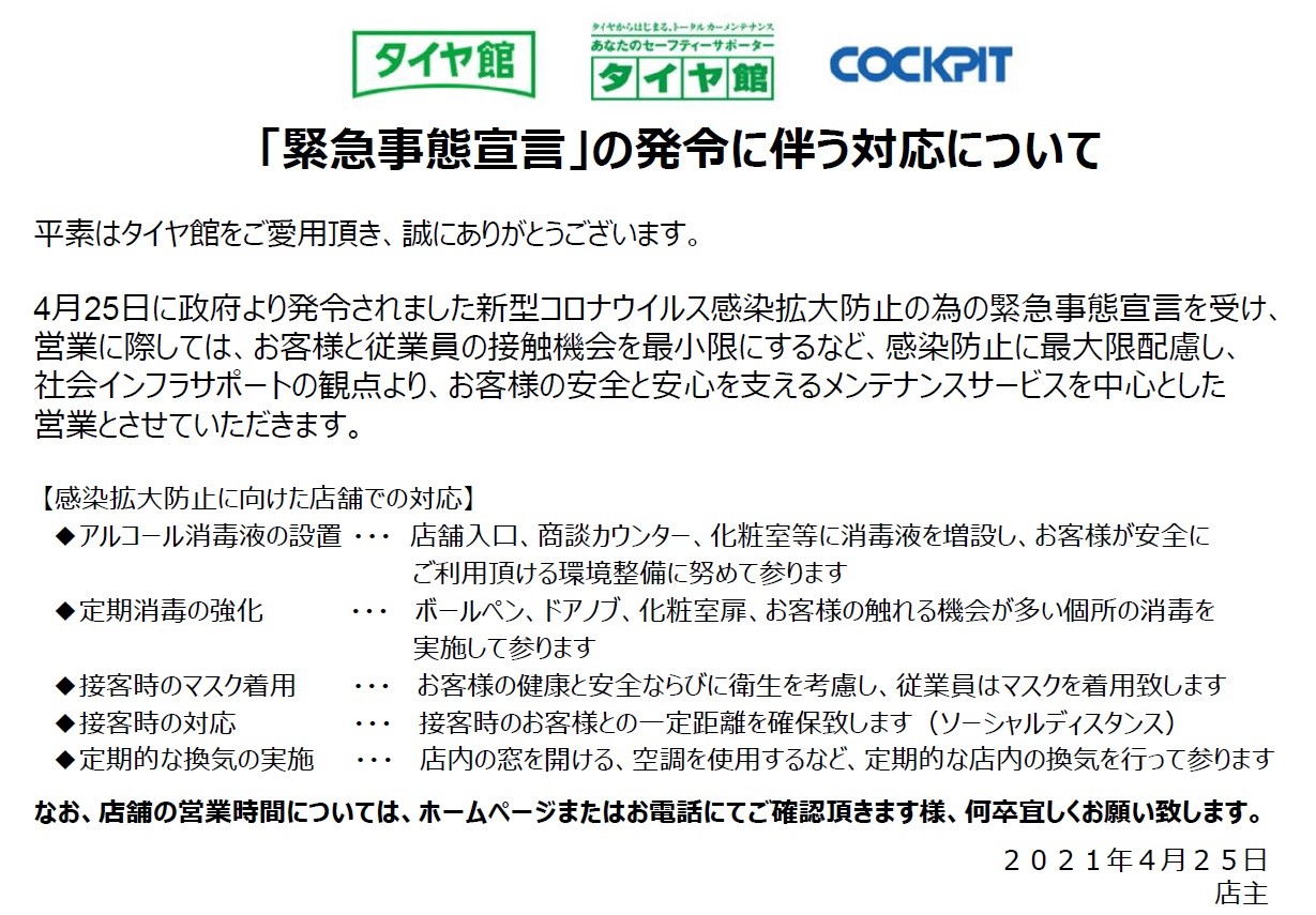 平素はタイヤ館をご愛用頂き、誠にありがとうございます。4月25日に政府より 発令されました新型コロナウイルス感染拡大防止の為の緊急事態宣言を受け、営業に際しては、お客様と従業員の接触機会を最小限にするなど、感染防止に 最大限配慮し、社会インフラサポートの観点より、お客様の安全と安...