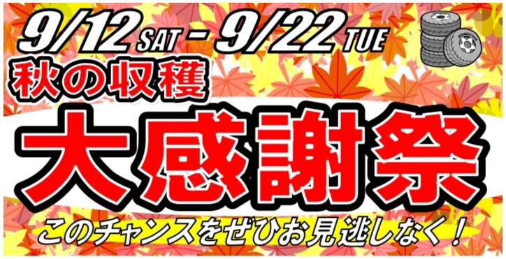 皆様!!お待たせいたしました!!! 明日9月12日(土)から9月22日(火・祝)までの10日間 秋の収穫・大感謝祭を開催致します♪♪ お買い得商品が盛りだくさんです!! ☆☆☆☆☆☆☆☆☆☆☆☆☆☆☆☆☆☆☆☆☆☆☆☆☆☆☆☆☆☆☆☆☆ タイヤ館明石は、明石市藤江の国道250号線(明姫幹線) 沿いにあります。 国道250号線をお通...