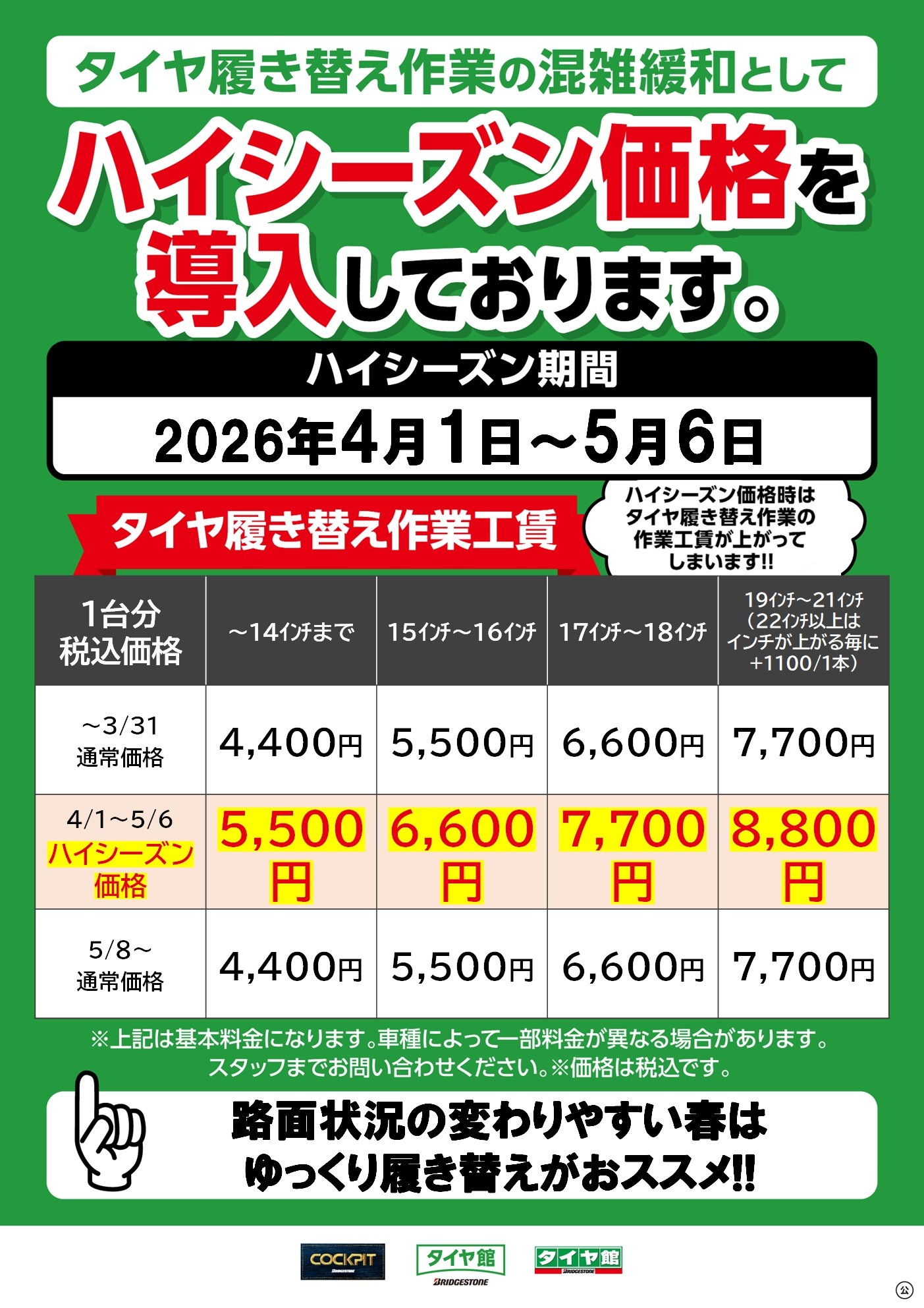タイヤ交換料金 ハイシーズン価格対応のご案内 2026年3月21日 4月はタイヤ履き替え作業の混雑緩和として、 ハイシーズン価格でのご対応になります。 4月1日~5月6日の期間は、店頭表示価格+1,100円となります。 ご迷惑おかけしますが、よろしくお願い致します。