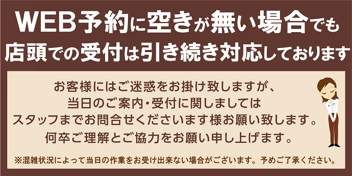 ※混雑状況によって当日の作業をお受け出来ない場合がございます。予めご了承ください。