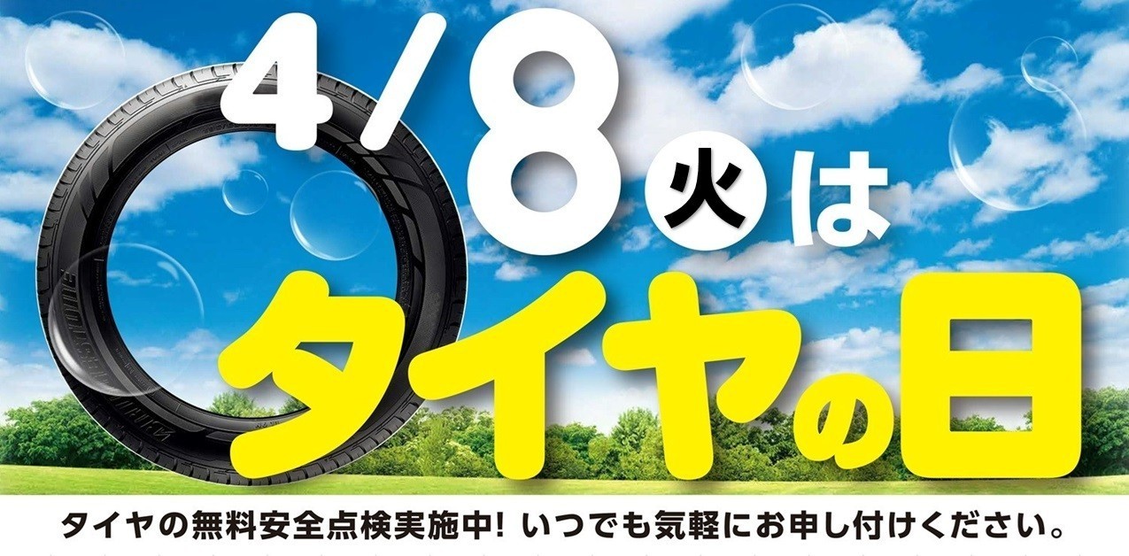 いよいよ明日はタイヤの日!! ポスト 2026年4月7日 いよいよ明日4月8日は『タイヤの日』です!! タイヤ館秋田東通店では、この『タイヤの日』をとても大事にしています。 4/1(火)~4/26(土)までの期間を『タイヤ点検強化月間』として、 タイヤの残溝・空気圧点検補充・ナットの締め具合などの点検を強化実施いたします! タイヤ点検を含めてお車の安全点検は基本いつでも無料で行っておりますので、 ご自宅でタイヤ交換された方もお気軽にご利用くださいませ。 皆さまのご来店をスタッフ一同心よりお待ちしております。