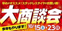 お待たせいたしました。いよいよ明日10月15日(土)〜10月23日(日)まで スタッドレスタイヤ大商談会を開催いたします! スタッドレスタイヤはもちろん、夏タイヤもお買い得! また、バッテリーや冬用ワイパー、スノーブラシなど冬の必需品もございます。 さらに、ご成約いただいたお客様へは10月15日(...