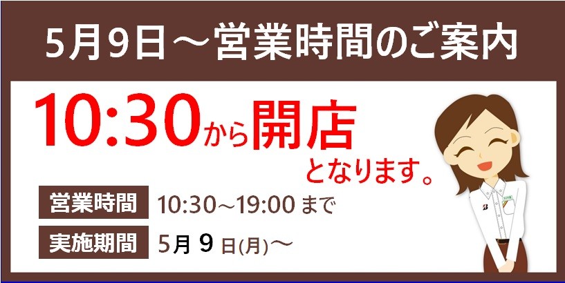 5月9日(月)より開店時間が変更となります。 変更前 10:00~19:00 ▼ 変更後 10:30~19:00 お間違いないようご注意ください。