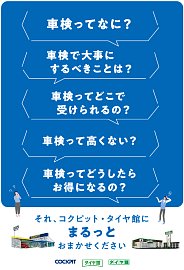 いつも当店をご利用頂きありがとうございます。 今回は、「車検」をよりお得にお受けいただくために、 コクピット/タイヤ館がオススメする「車検前点検」についてご紹介いたします。 【車検前点検は、出費を集中させない、かしこい車検の受け方】 ・車検って何?車検って良く分からない! ・はじめ...