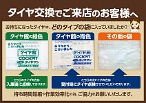 当店での持ち込みタイヤ交換についてのご案内です! ◆まず、受付にて会員登録の確認の後、タイヤの袋の色の確認をさせていただきます。 前回当店でタイヤ交換をしていただいた場合、ミゾや年数などに問題なければ緑の袋に、残りミゾが少ない、年数がたっている、ゴムの劣化があり交換した方がいい場...