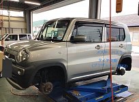 通常の乗用車とは違う足廻り、さらにリフトアップされているジープでした。 調整できるのは4ヶ所。 大きな狂いはなかったのですが、測定結果をみての調整と目視での確認をして作業を進めました。 最後に試乗して状態確認をして作業終了となりました! 作業時間:約1時間