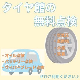 タイヤ館秋田東通店のHPをご覧いただき ありがとうございます。 タイヤ館で行っている無料点検はご存じでしょうか? タイヤ点検 ・何年履いてるタイヤだっけ? ・冬タイヤは今年も履けるかな? ・駐車の際にぶつけちゃったけど大丈夫かな? などご自身では判断が難しい場合はぜひ当店までご来店くだ...