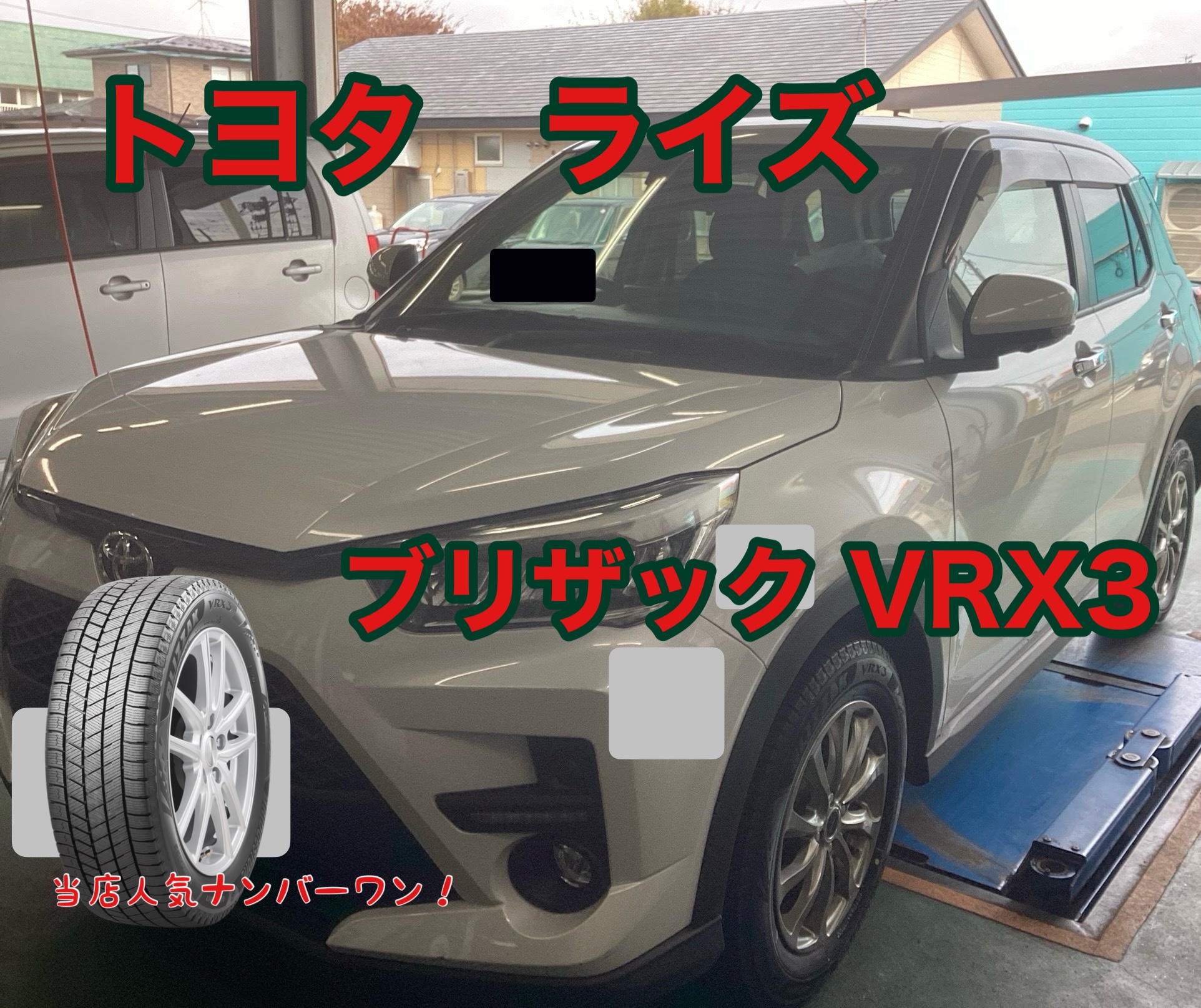 車種:トヨタ ライズ タイヤ:VRX3 サイズ:195/65R16 ここ数日ぐんと気温が下がって、冬に近づいてきました。 少しあられも降ったことで、冬タイヤへの交換をされるお客様が増えてきています。 ブリザックシリーズの中でも一番氷上性能の優れるVRX3。 効きが長持ちするため、冬タイヤの交換目安の...