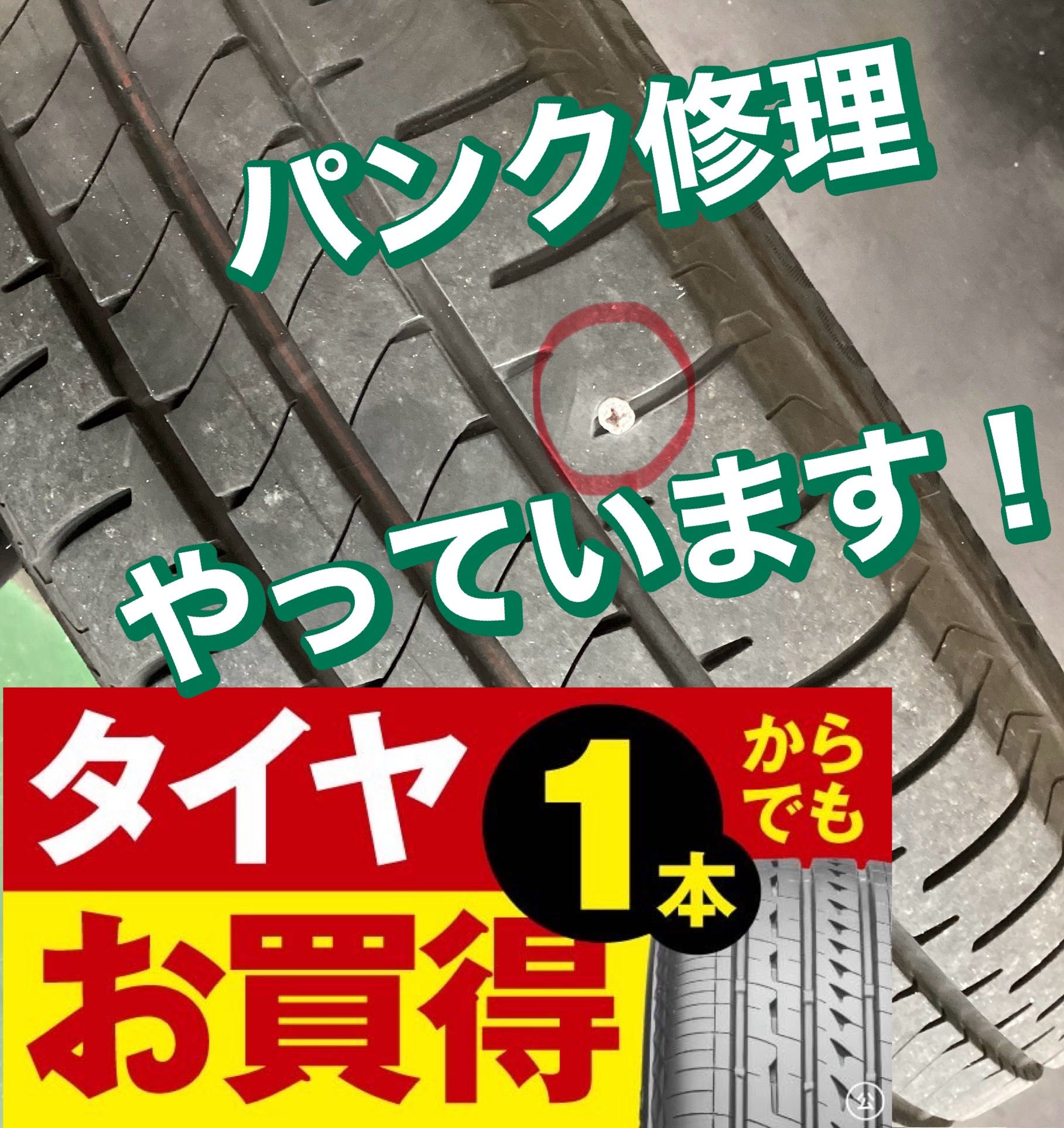 当店では、パンク修理作業承っております。 パンク修理可能な場所は、路面に接する部分(トレッド部)のみとなっております。 修理可能な場所であっても傷の大きさなどにより修理できないこともありますので、一度点検してからの作業となります。 修理不可の場合も、新品交換は1本からできますので...