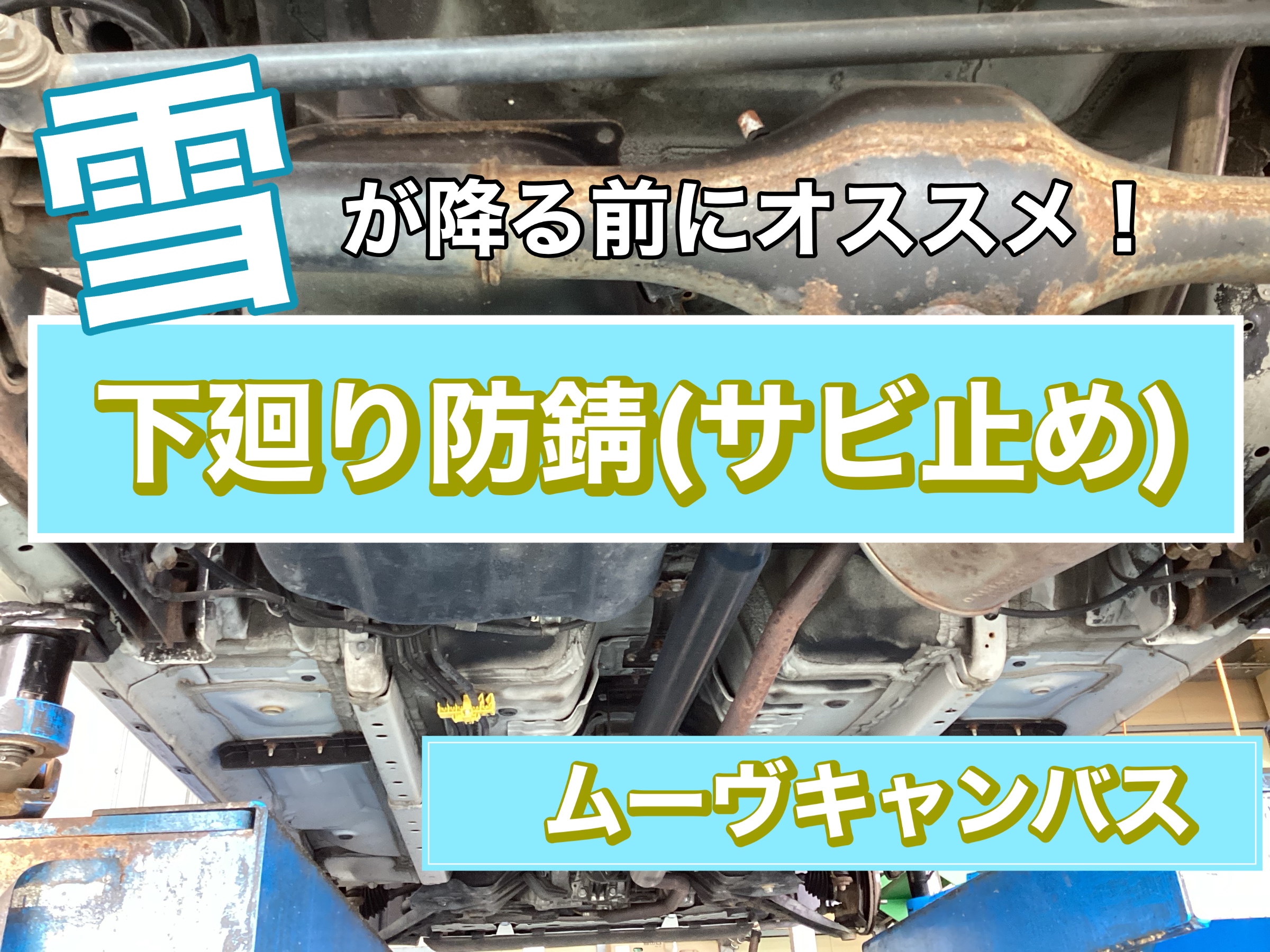 ダイハツ ムーヴキャンバスに【下廻り防錆剤】施工作業を行いました! 冬は道路に融雪剤が撒かれるので、何もしていないと車の下廻りはサビだらけに… シーズン前に施工してあげると、より安心です(^^) もちろんすでにサビが出ている場合も進行を抑制してくれるので、効果あり! お車の冬支度にオス...