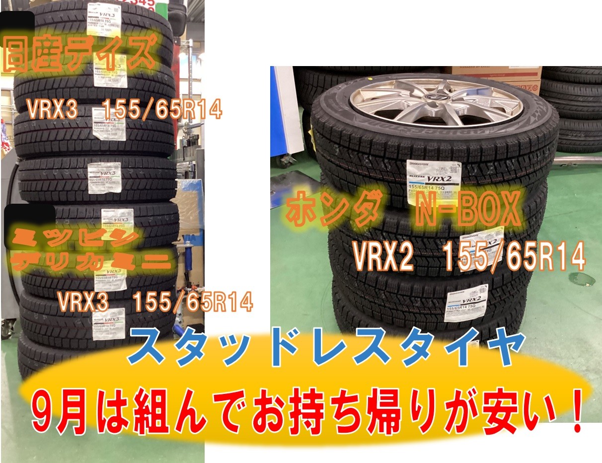 9月に入ると、スタッドレスタイヤのお話がぐんと増えてきました。 今は、スタッドレスタイヤはお持ち帰りがお買い得価格となっています(^^)/ セール期間中もたくさんのお客様にご成約いただいております。 御見積だけでもぜひ、ご来店ください! ミツビシ デリカミニ VRX3 サイズ:155/65R14 ホン...