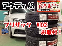 本日はアウディA3のお客様へスタッドレスタイヤを ご成約です! タイヤサイズ 205/55 R16 お客様のご指定でVRX3でお取付となりました! ご成約ありがとうございます。 この冬道で滑ってしまい、ヒヤリとしたお客様は 一度タイヤ点検がおすすめです。 無料で点検しております!