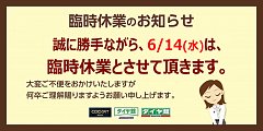6月14日(水)は臨時休業となります。予めご了承下さい。 6月15日(木)から通常通り営業いたします。 営業時間 10:30〜19:00 最終作業受付時間 18:30 皆様のご来店お待ちしております。